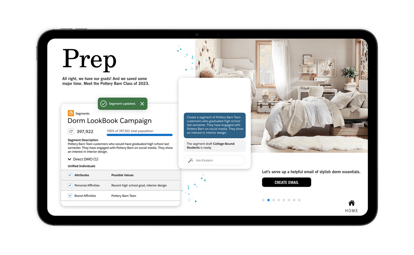 At Dreamforce, we created an interactive experience to show how Salesforce Einstein AI empowers marketers. Using the metaphor of preparing and serving a meal, the journey guided audiences through four stages of campaign creation. Visitors could choose from three scenarios, cookware, nursery, or dorm, and see how AI streamlines segmentation, content creation, and personalization.